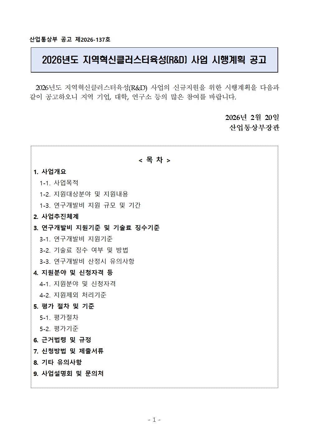 2026년도 지역혁신클러스터육성(R&D) 사업 시행계획 공고